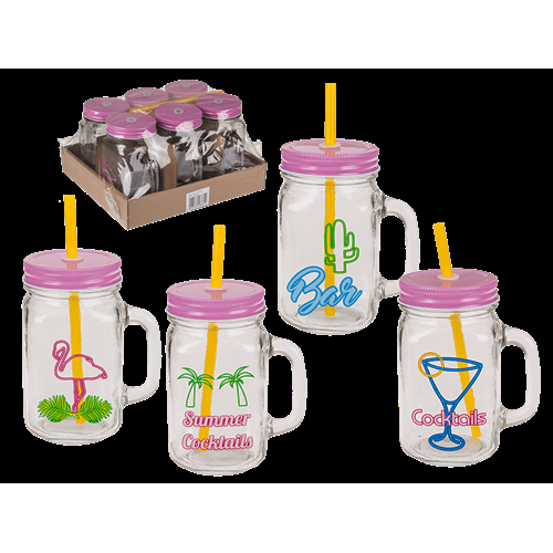 BICCHIERE RETRO SUMMER BARATTOLO C/MANICO + COP. 450ML 4ASS.